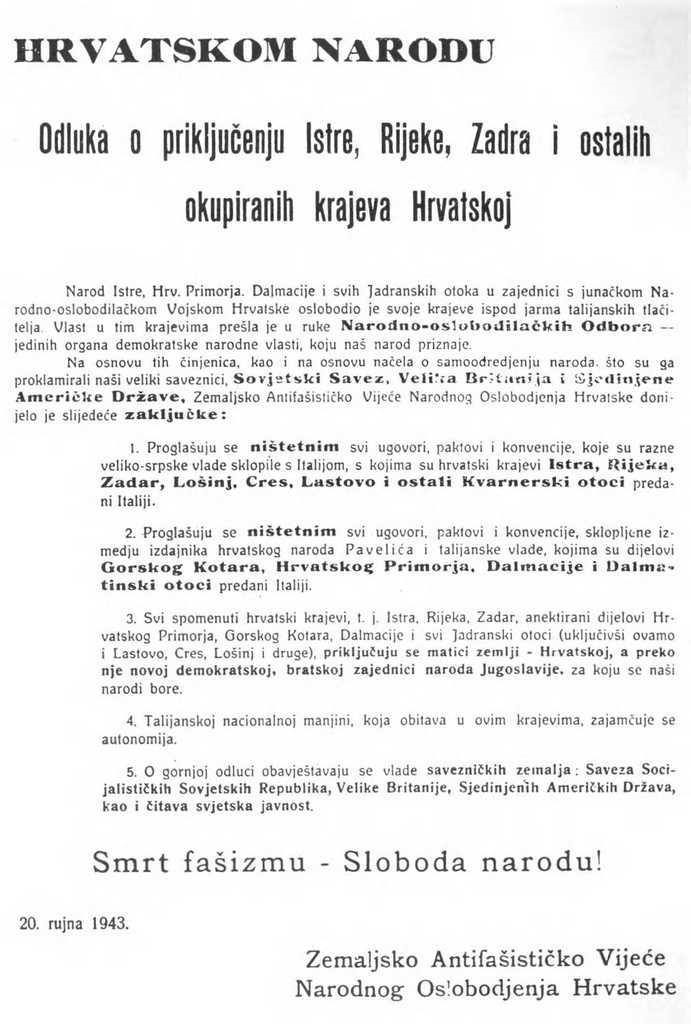 Narod Istre, Hrvatskog Primorja, Dalmacije i svih Jadranskih otoka u zajednici s junačkom Narodnooslobodilačkom vojskom Hrvatske, oslobodio je svoje krajeve ispod jarma talijanskih tlačitelja. Vlast u tim krajevima prešla je u ruke Narodnooslobodilačkih odbora – jedinih organa demokratske narodne vlasti, koju naš narod priznaje. Na osnovu tih činjenica, kao i na osnovu načela o samoodređenju naroda, što su ga proklamirali naši veliki saveznici Sovjetski Savez, Velika Britanija i Sjedinjene Američke Države, Zemaljsko antifašističko vijeće narodnog oslobođenja Hrvatske donijelo je slijedeće zaključke: